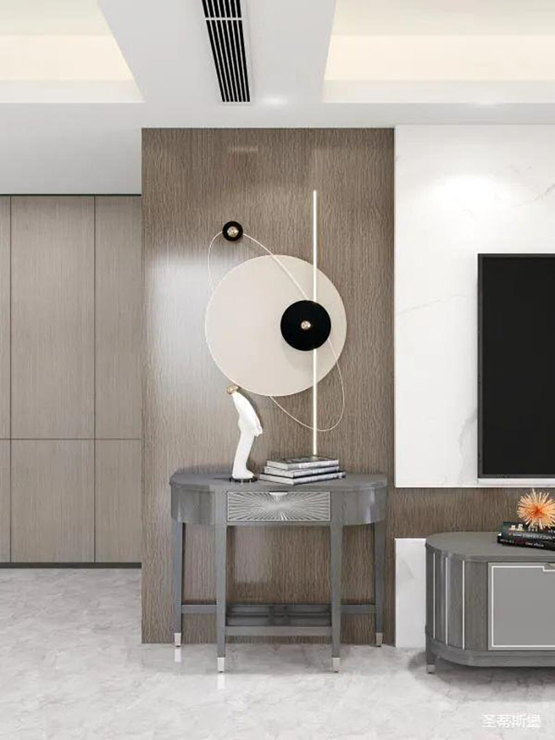 ▲设计师巧妙的运用填充艺术,将客厅电视与沙发背景色彩相呼应,利用凹凸互补的设计手法,传递着空间时尚。莫兰迪实木家具,配以同色系的高级金属底座,将精致轻奢从细节中脱颖而出。