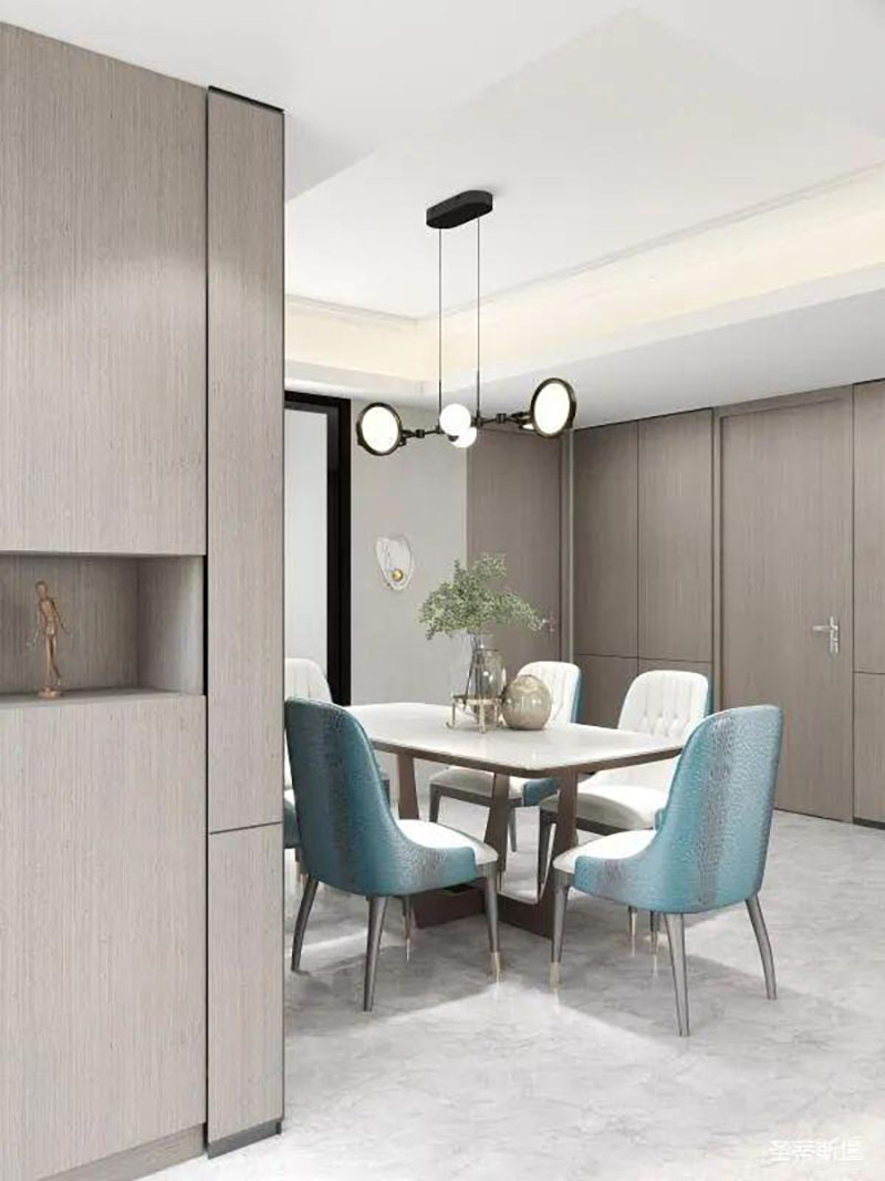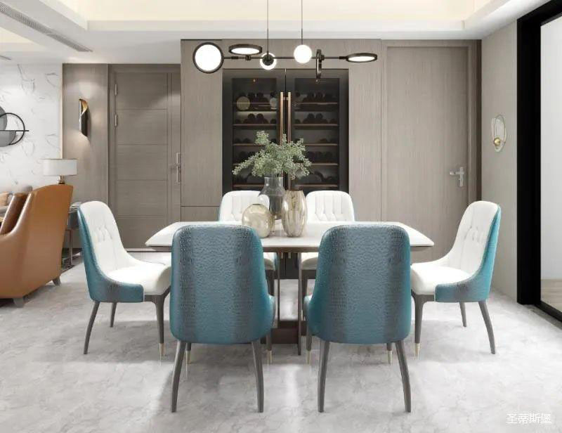 ▲澄亮湖蓝的餐桌椅,一定是空间的点睛之处,温柔跳脱的色彩,赋予了生活多姿多彩的体验。经典黑的简约灯饰,在不忘温馨氛围的同时,也引领着造型界的时尚潮流。